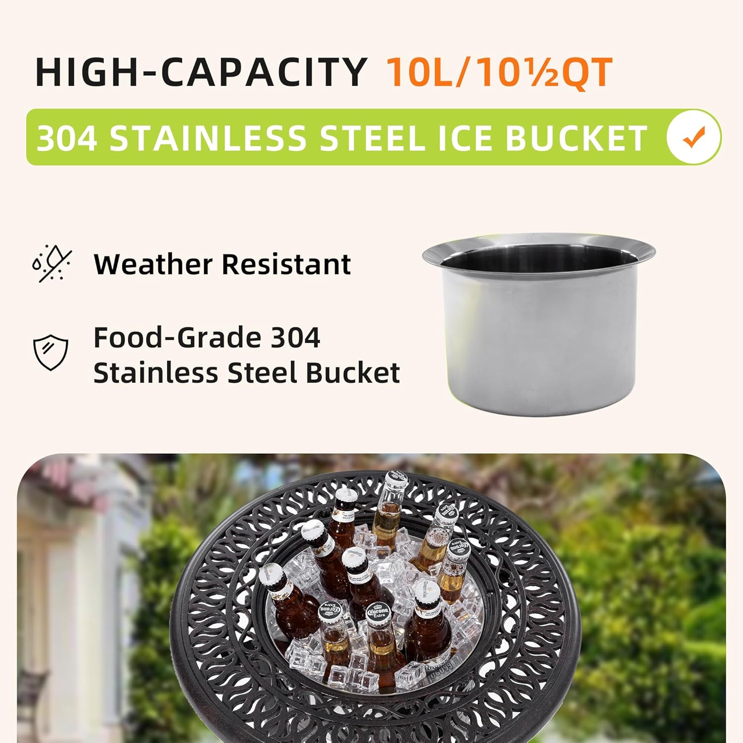 21" Outdoor Patio Round Side Table with 304 Stainless Steel Bucket, Cast Aluminum Outdoor Bistro Table with Umbrella Hole for Poolside, Deck, Backyard, Balcony