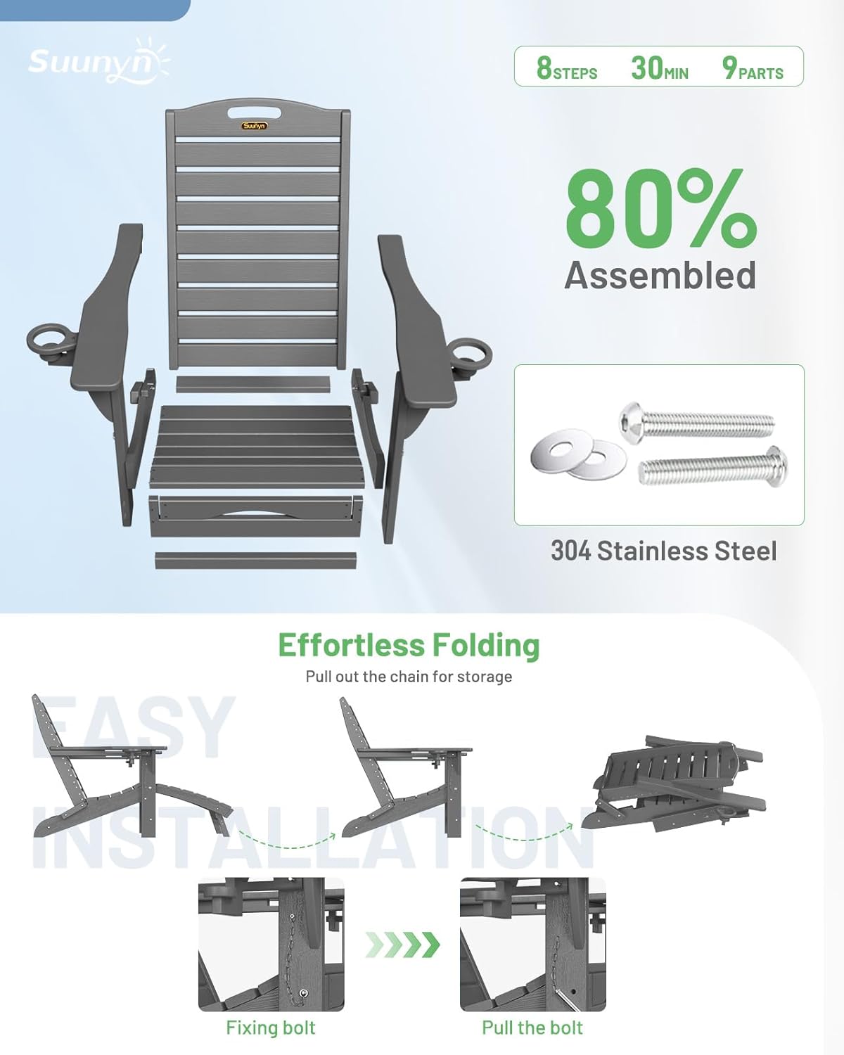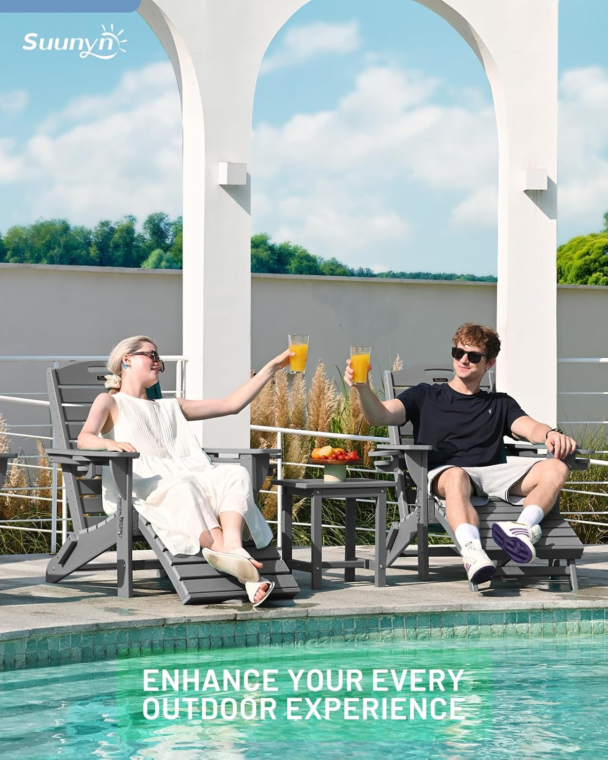 Folding Adirondack Chair with Retractable Ottoman Weather Resistant Fire Pit Chair Patio Chair with 2 Cup Holder Lawn Outdoor Lounge Chairs (Grey)