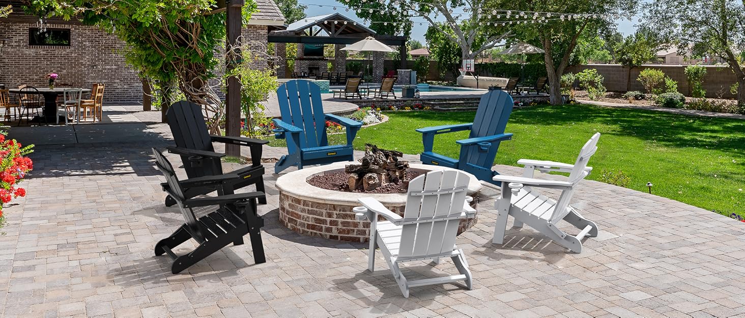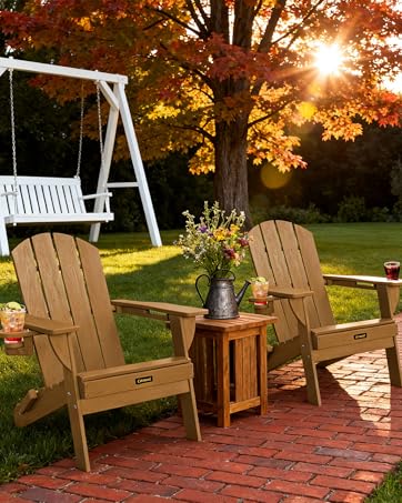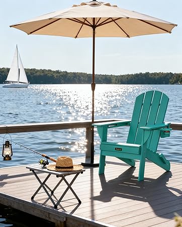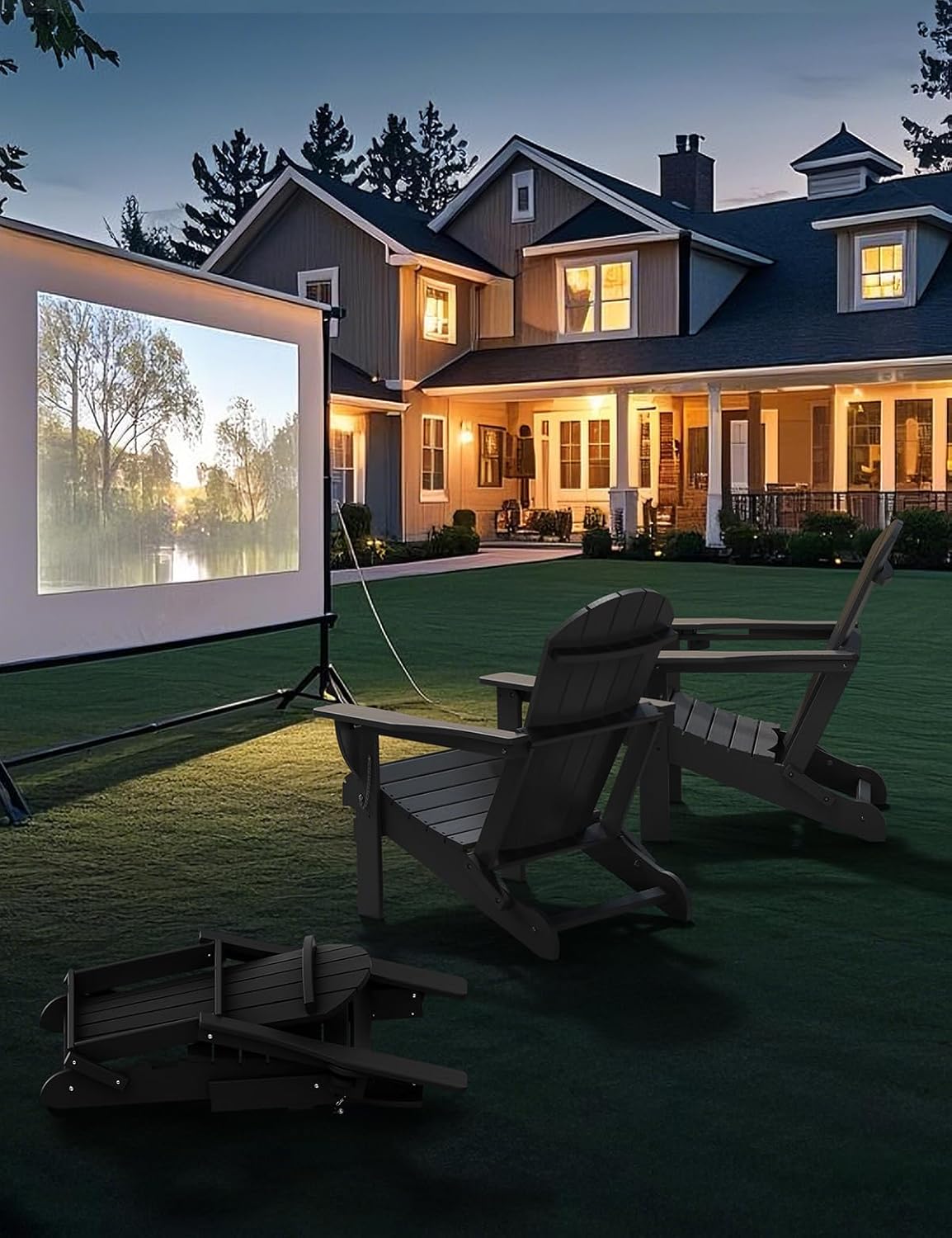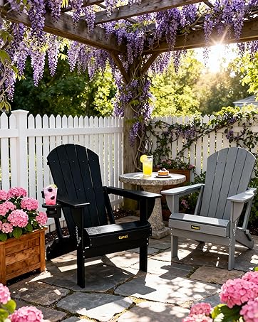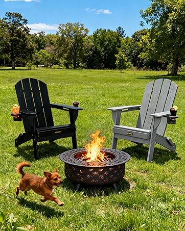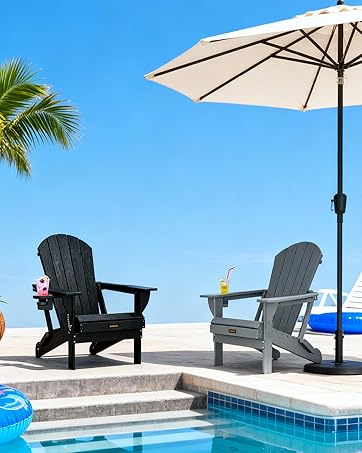 Plastic HDPE Adirondack Chair, Folding Adirondack Chair Weather Resistant with Cup Holder, Wooden Textured Fire Pit Outdoor Chair for Garden, Porch, Lawn, Backyard, Supports 380LBS, Black
